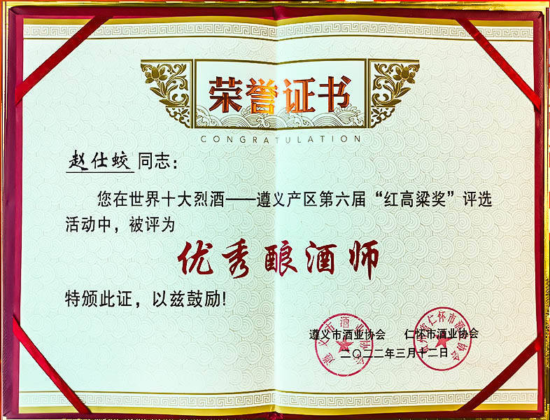 2018年,趙仕蛟榮獲中國酒都十大工匠榮譽稱號。2019年,他被任命為黔醉酒業(yè)首席質量官。2022年,他又擔任了黔醉酒業(yè)總工程師,并于同年榮獲世界十大烈酒-遵義產區(qū)第六屆“紅高粱獎”優(yōu)秀釀酒師。